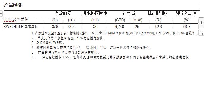 FilmTec™ SW30HRLE-370/34i 元件是一款高耐久性、高脫除率、高產(chǎn)水量海水膜元 件,用于高污染或挑戰(zhàn)性水源的情況,有助于系統(tǒng)的穩(wěn)定運(yùn)行和產(chǎn)水成本的降低。