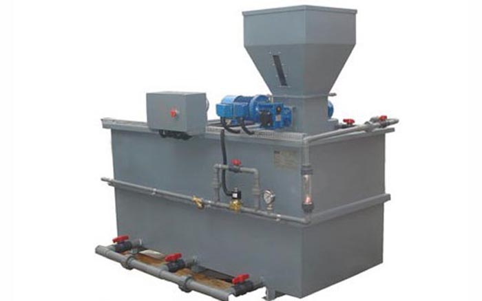聚合物溶液制備過程是通過各個溶液箱分級逐步處理完成的.溶液箱之間隔開。保證每個溶液箱內(nèi)的最佳反應(yīng)時間和恒定的濃度.避免在預(yù)制箱和最終溶液箱之間產(chǎn)生任何直接通路。該設(shè)備由控制箱自動控制.此控制箱與安裝在最終溶液箱上的液位計相連.一旦液位達到“低位”,觸發(fā)電動進水閥打開。觸點式流量計就啟動干投機.干投量的大小按照水量而定,以獲取精確的濃度,一旦達到“高位”此循環(huán)過程就停止。當然兩(或三個)攬拌器還在工作。該設(shè)備還用于將乳膠狀的陽離子、陰離子或無離子型的聚合物連續(xù)自動的制成標準稀釋濃度(0.3-5g/L)的溶液。盡管一般認為乳膠狀的聚合物制成標準溶液所需的熟化時間大大少于粉粒狀聚合物,但是在將藥耗達到最佳狀態(tài)過程中總是推薦要充分的熟化時間。