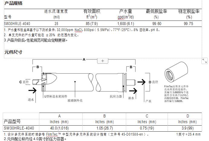 FilmTec™ SW30HRLE-4040 反滲透膜元件是 SW30HRLE-400 膜元件對應的 4 英寸產 品。SW30HRLE-400 是業界領先的海水淡化膜元件,同時具有前所未有的高產水 率和脫鹽率,使得凈化高鹽度水的系統制水總成本最低。