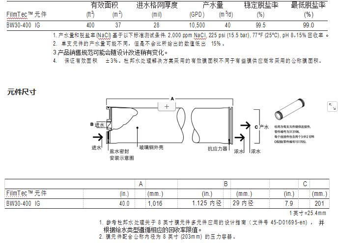 FilmTec™ BW30-400 在要求高品質的產水時是很好的產品選擇。這是市場上第一 款 400 平方英尺的膜元件,繼續被廣泛用于新設備和舊系統改造,尤其系統資 金和生產力是考慮因素時。BW30-400 IG 保持了與 BW30-400 膜元件相同的流量 和脫鹽性能,只不過它不具備 ANSI 標準 61 認證或是 KIWA 認證,從而為工業級 的應用提供了更具成本效益的選擇。