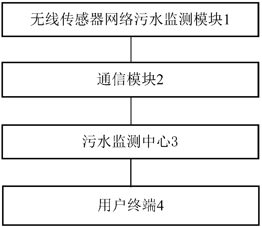 本發(fā)明的有益效果為:利用無(wú)線傳感器技術(shù)實(shí)現(xiàn)了污水的監(jiān)測(cè),使得環(huán)保相關(guān)部門能夠及時(shí)發(fā)現(xiàn)水環(huán)境污染事故,對(duì)事故的發(fā)生和發(fā)展進(jìn)行監(jiān)測(cè)評(píng)估,制定緊急對(duì)策和措施。