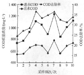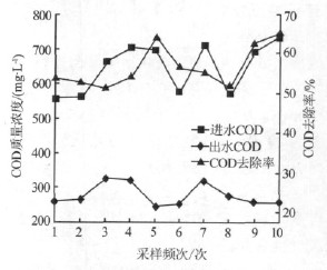 水解酸化池對COD的去除效果如圖2 所示。