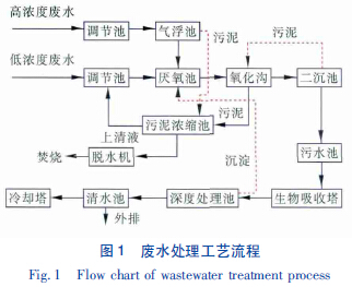 高濃度涂料廢水中TSS 含量較高,需進(jìn)行氣浮處理以去除少量SS 及油性物質(zhì),氣浮處理出水與低濃度廢水混合進(jìn)入調(diào)節(jié)池。調(diào)節(jié)池出水進(jìn)入水解酸化池,出水進(jìn)入一體化氧化溝,主要完成有機(jī)污染物的去除和同步硝化反硝化脫氮,再通過生物吸收塔和深度處理工藝,以確保出水達(dá)標(biāo)排放。具體處理工藝如圖1 所示。