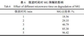 微波輻射時間對MG 降解率的影響如表6 所示。由表6 可知,隨著微波輻射時間的延長,孔雀石綠的降解率逐漸增加,足夠的微波輻射時間,對孔雀石綠在微波誘導下發生催化降解反應特別重要,較長的微波輻射時間與較高的孔雀石綠對應。當微波輻射時間為5 min 時,孔雀石綠降解率達到96.42%。