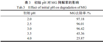初始pH 對MG 降解效果的影響如表3 所示。由表3 可知,pH 在2.0~3.0 時脫色效果較好。當pH較高時,羥基自由基的產生受到了抑制,同時Fe3+ 還會以氫氧化物的形式沉淀,使催化活性降低。另外,H2O2在堿性條件下會發生無效分解,導致H2O2的利用率降低,使得反應不能順利進行,從而脫色率降低。故孔雀石綠初始pH 定為3.0。