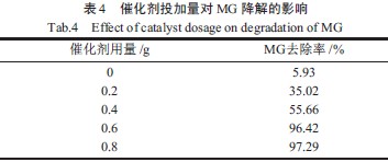 催化劑Fe2O3/γ-Al2O3投加量對MG 降解率的影響如表4 所示。由表4 可知,沒有催化劑存在時孔雀石綠降解率很低,僅為5.93%,盡管H2O2在微波輻射下會產生·OH,但該途徑發揮的作用十分有限,隨著催化劑的加入,孔雀石綠的降解率迅速增加,說明催化劑的作用在孔雀石綠降解中作用顯著;隨著催化劑的繼續增加,孔雀石綠的降解率變化趨于平緩。當催化劑投加量為0.6 g時孔雀石綠降解率達到96.42%。