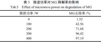 微波功率對MG 降解的影響如表5 所示。由表5 可知,當沒有微波作用時,孔雀石綠的降解率僅為1.52%,顯然,沒有微波介入的其他途徑對孔雀石綠降解的影響較為有限。微波功率為100 W時,MG 降解率提高至40%以上,降解效果比較明顯。當微波功率增加到300 W 時,孔雀石綠降解率達到96.42%,繼續增加微波功率,降解率變化不大,這是由于,微波功率較低時,隨著微波功率的增大,高強度的微波能加劇反應物MG 分子的熱運動,削弱分子內原子間鍵能,同時促進H2O2催化分解產生·OH,提高孔雀石綠的降解率;微波功率增加到一定程度,高強度的微波能使體系溫度驟然上升,H2O2在較高的溫度下易分解生成氧氣和水,故孔雀石綠的降解率變化不大。根據試驗結果,適宜的微波功率為300 W。