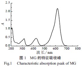 配置質量濃度30.00 mg/L 的孔雀石綠溶液,吸光度用NE-300 紫外- 可見分光光度儀對其在200~800 nm 掃描,測出其比較大吸收波長為616 nm(見圖1),本文中所有吸光度數據均用去離子水為參比;孔雀石綠染料pH 采用pHs-3c 型精密酸度計測定。