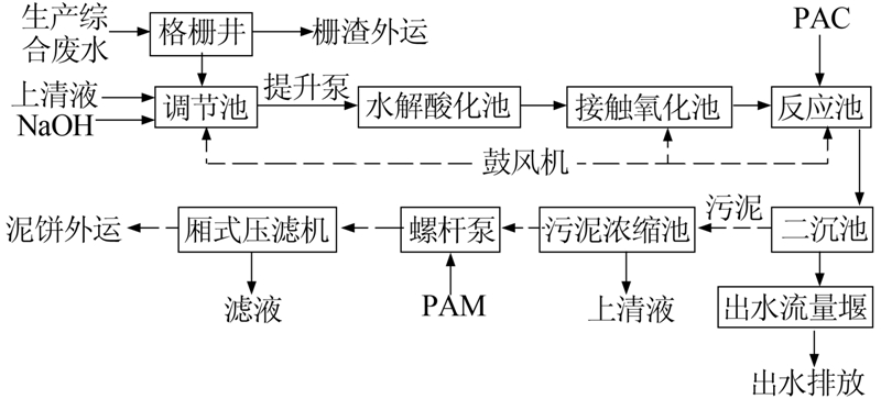 生產(chǎn)廢水中含有的較大藥渣、漂浮物顆粒經(jīng)過前置的格柵攔截后得到有效去除,廢水經(jīng)格柵井后自流入調(diào)節(jié)池進(jìn)行初步的勻質(zhì)、勻量,同時(shí)在調(diào)節(jié)池內(nèi)由計(jì)量泵添加一定濃度的堿液,將廢水的pH由初始的4.0~6.0調(diào)整為7.0~9.0;在調(diào)節(jié)pH的同時(shí)需利用羅茨鼓風(fēng)機(jī)往池內(nèi)曝氣,主要是因?yàn)樵谡{(diào)節(jié)池內(nèi)對(duì)廢水進(jìn)行預(yù)曝氣及攪拌可以盡可能地避免大量SS在調(diào)節(jié)池內(nèi)堆積和發(fā)酵,同時(shí)還能夠?qū)U水中的低分子有機(jī)污染物吹脫氧化。隨后由潛污泵提升至水解酸化池。在水解酸化池中得到馴化、培養(yǎng)的大量厭氧微生物,則直接將廢水中所含的大部分高分子有機(jī)污染物破碎降解為小分子有機(jī)污染物,進(jìn)而提高廢水的可生化性,有效地緩解后續(xù)好氧生化處理工序的處理壓力。廢水經(jīng)水解酸化處理后自流進(jìn)入接觸氧化池,接觸氧化池中的好氧微生物種群及硝化菌菌群在池內(nèi)羅茨鼓風(fēng)機(jī)曝氣充氧的情況下,大量的有機(jī)污染物被好氧微生物種群氧化降解為CO2和H2O,廢水中的氨氮?jiǎng)t被氧化為硝酸鹽和亞硝酸鹽得以去除。經(jīng)接觸氧化池處理后的出水還需通過外加聚合氯化鋁(PAC)進(jìn)行比較終的混凝沉淀反應(yīng),作用是使廢水中不易沉淀的細(xì)小顆粒絮體凝聚形成大顆粒絮體,混合液隨后進(jìn)入二沉池內(nèi)進(jìn)行固液分離,保證比較終出水水質(zhì)穩(wěn)定達(dá)到排放標(biāo)準(zhǔn)要求。固液分離后的上清液溢流進(jìn)入出水流量堰可達(dá)標(biāo)排放,剩余污泥則排入污泥濃縮池進(jìn)行污泥濃縮處理。