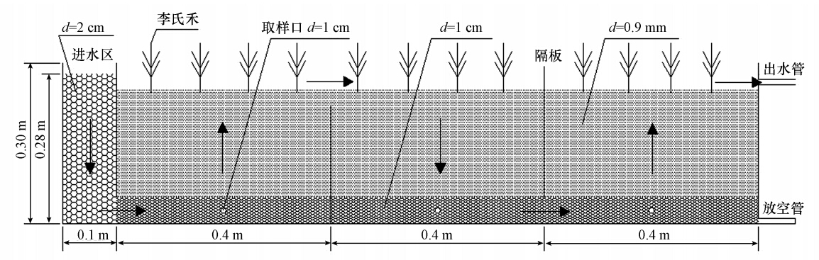 實驗于溫室大棚中進行,采用以PVC板材粘合成的三段式波形潛流式人工濕地(1.3 m×0.5 m×0.3 m,長×寬×高,圖 1).其中,進水區(qū)長0.1 m,濕地長1.2 m,濕地平分為3段,每段長0.4 m.設(shè)計的表面負荷率為0.1 m3 · m-2 · d-1,進水流量為0.06 m3 · d-1,水力停留時間為1 d.進水區(qū)填充高0.28 m的礫石(粒徑2 cm左右),基質(zhì)深度為0.25 m,其中,下層為0.05 m的礫石(粒徑1 cm左右),上層為0.2 m的稻田土+泥炭混合基質(zhì)(稻田土 : 泥炭=2 : 1,體積比,粒徑0.9 mm左右).濕地植物——李氏禾從桂林市郊采集,以80株 · m-2成行種植于基質(zhì)表面.李氏禾中的鉻含量未檢測到,基質(zhì)中的鉻含量為(5.47±0.15)mg · kg-1,加入到濕地中的基質(zhì)質(zhì)量約為132.0 kg,基質(zhì)中的有機質(zhì)含量為3.50%±0.06%,pH為7.52±0.02,Eh為(392.7±4.5)mV.