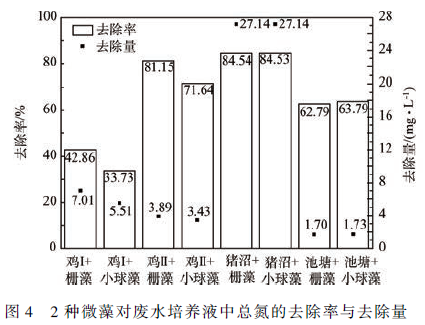 由圖3 可知,在雞Ⅱ培養液中柵藻和小球藻對硝氮的去除率比較高。豬沼培養液中,2 種微藻對硝氮的去除率低于其他組,但均在60% 以上。2 種微藻對硝氮的去除效果大致相同,去除量由大到小依次為:豬沼、雞Ⅱ、雞Ⅰ、池塘,均隨著硝氮初始濃度的降低而減少。剩余量除豬沼組(柵藻4. 70 mg·L - 1 ,小球藻4. 74 mg·L - 1 )外,其余各組較少(0. 30 mg·L - 1 左右)。