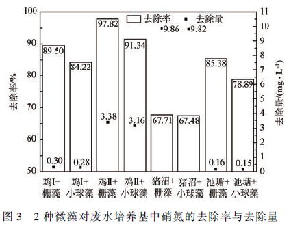 由表1 可見,雞Ⅱ和豬沼培養液中硝氮的濃度大于氨氮濃度,氨氮的抑制作用較弱,2 種微藻對硝氮的吸收利用較多。尤其在豬沼中,雖然2 種微藻的去除率都不高,但是去除的絕對量比較多(柵藻9. 86mg·L - 1 ,小球藻9. 82 mg·L - 1 )。對于雞Ⅰ和池塘培養液,雖然氨氮濃度大于硝氮,抑制作用強,但因其初始值很低,故而雖實際的去除量并不大但去除效率高。有研究結果顯示,硝氮較適合普通小球藻的生長。因此,在硝氮含量比較高的豬沼培養液中收獲的小球藻藻粉質量也比較多。對比2 種微藻對硝氮的去除率發現,柵藻對硝氮的吸收同化效果稍好于小球藻。