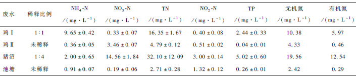 養(yǎng)雞場(chǎng)廢水和養(yǎng)豬場(chǎng)沼液均取自合肥溫氏畜牧有限公司下屬養(yǎng)殖場(chǎng)。其中雞Ⅰ廢水(以下簡(jiǎn)稱“雞Ⅰ”)為雞舍污水厭氧發(fā)酵處理后,進(jìn)入植物凈化池的廢水;雞Ⅱ廢水(以下簡(jiǎn)稱“雞Ⅱ”)為經(jīng)植物池凈化后進(jìn)入第二植物凈化池的廢水;豬沼廢水(以下簡(jiǎn)稱“豬沼”)為豬場(chǎng)通過(guò)清糞-沉淀池-酸化池等處理工藝流程排出的沼液經(jīng)沉淀后的上清液;池塘廢水(以下簡(jiǎn)稱“池塘”)為本單位觀賞魚(yú)養(yǎng)殖池塘水。
