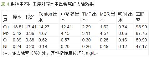 由表4可見,廢水經過酸沉、Fenton氧化、電絮凝工序后,重金屬略有降低。經過TMF固液分離系統后,Cu的去除效果比較好,去除率達到87%。經過MBR生化處理后,廢水中重金屬Cu、Pb、Cr、Ni的質量濃度分別減少至0.74、0.66、0.25、0.19mg/L,再進一步吸附后,4種重金屬的去除率分別達到95.99%、87.75%、59.90%、47.14%,其出水濃度均達到(GB21900—2008)表3標準的要求。具體參見http://www.dowater.com更多相關技術文檔。