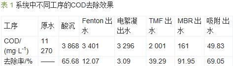 系統連續運行期間,原廢水COD為8000~18000mg/L,經過酸沉、Fenton氧化、電絮凝、TMF過濾和MBR等工序后,COD去除率達到85%~90%,進一步吸附后COD的質量濃度降低至50mg/L以下。
