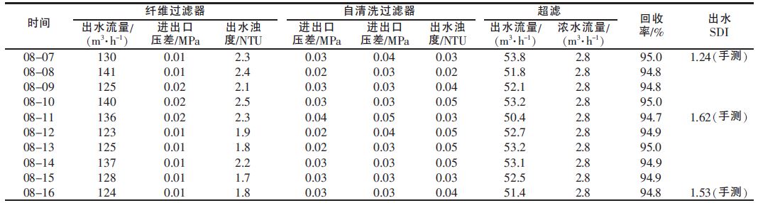 由表 1 可見,預處理系統出水濁度為0.02~ 0.05 NTU,SDI<2,完全滿足反滲透入水要求。