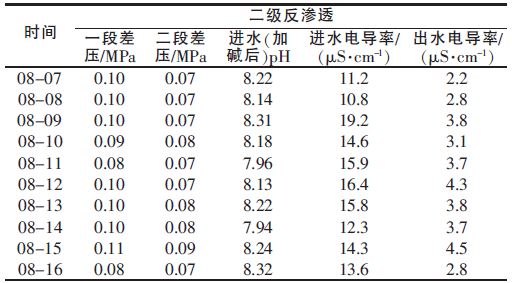 表 2 一級反滲透運行結果 注:以2012-08-07~2012-08-16 十天運行數據為例。