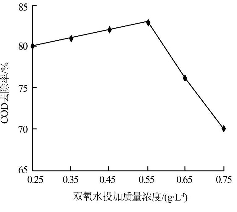 在pH=3.0,鐵炭總質(zhì)量濃度20 g/L,反應(yīng)時間40 min,MnO2投加質(zhì)量濃度為2.50 g/L,鐵炭比3∶1條件下,分別加入0.25、0.35、0.45、0.55、0.65、0.75 g/L H2O2進行實驗,考察H2O2對微電解處理廢水體系的催化作用,結(jié)果如圖3所示。