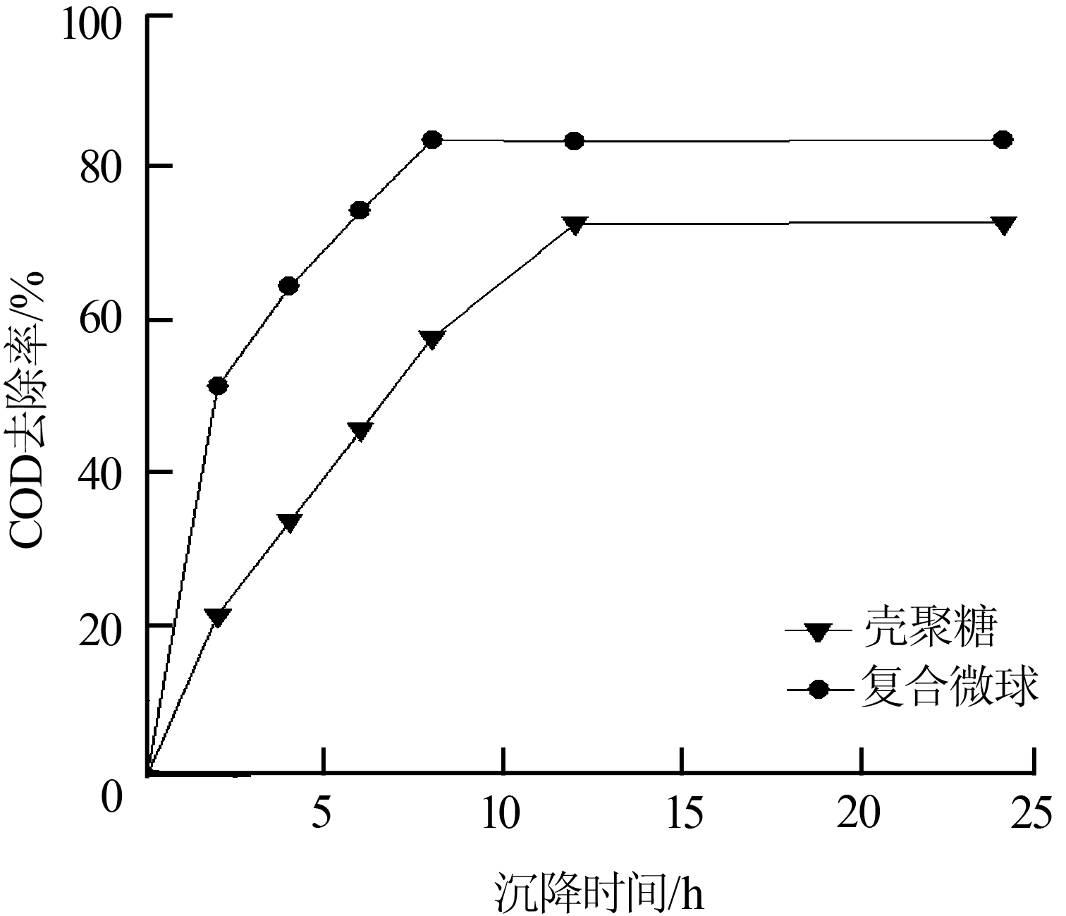 在攪拌速度為120 r/min,復(fù)合微球投加量為6 mg/L(對比實驗殼聚糖投加量為8 mg/L),沉降時間為24 h的條件下,考察了pH對處理效果的影響,結(jié)果如圖 1所示。由圖 1可知,對于單一殼聚糖而言,只在比較適的pH下才能起到比較好的處理效果。而對于復(fù)合微球,pH對處理效果的影響較小,在pH 為4~9的范圍內(nèi)COD去除率均在75%左右。復(fù)合微球在其分子結(jié)構(gòu)上具有殼聚糖本身所擁有的羥基、氨基等活性基團(tuán),同時具有交聯(lián)劑帶來的羧甲基活性基團(tuán),所以在酸性或堿性條件下均可以在一定程度上接受和供給H+,進(jìn)而起到穩(wěn)定的絮凝的作用。