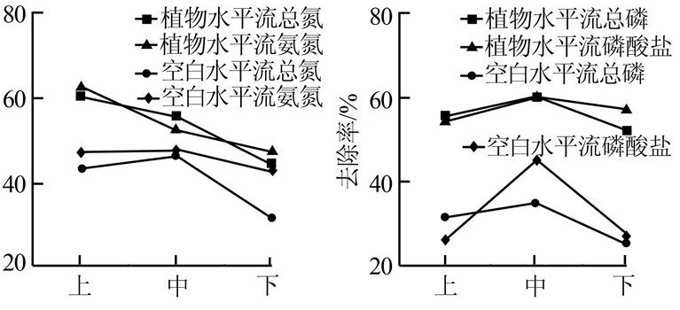 為提高水平潛流人工濕地的處理效果和預防堵塞,實驗在濕地上、下基質(zhì)層采用大粒徑礫石,以利于濕地通過上部空間進行富氧及植物根系向濕地下部深處進行繁殖;中間層采用小粒徑礫石,便于增加礫石表面積,從而加大濕地基質(zhì)與污水的接觸面積和微生物的附著面積。濕地對營養(yǎng)物去除率的空間變化情況如圖 3所示。
