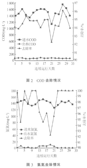 系統在2010 年2 月末調試成功,運行穩定。調試成功后一個月內的進出水CODCr及氨氮情況如圖2、圖3 所示。