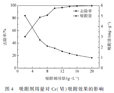 取初始濃度為20 mg·L - 1 的Cr(Ⅵ)水樣50 mL 于100 mL 的具塞錐形瓶中,調節pH 值為2. 0,吸附劑用量分別為2、6、8、10、12、14、16 和20 g· L - 1 ,設定搖床的轉速為200 r· min - 1 ,于25 ℃ 下振蕩180 min,測定吸附后的Cr(Ⅵ)的濃度。