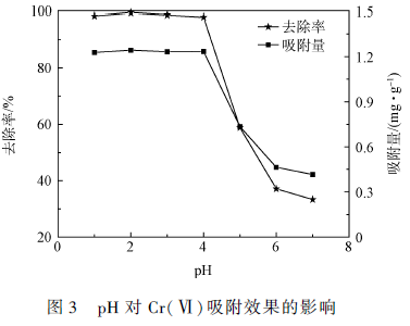 有研究表明,pH 值的大小會會影響吸附劑表面的活性基團的存在狀態和Cr(Ⅵ)在水中的化學形態,因而對Cr(Ⅵ) 的去除效果影響很大。由圖3可知,當pH < 4. 0 時,新增加的N—H 基團與H3O +相結合,并與Cr(Ⅵ) 發生絡合作用,Cr(Ⅵ) 的去除效果較好,溶液中只存在HCrO4- 陰離子,與炭化核桃殼表面的活性基團更好地結合,故去除率較高,當逐漸增加pH 值時,溶液中Cr(Ⅵ) 存在形態較多,OH - 離子含量逐漸增加,反應體系中存在競爭吸附,故Cr(Ⅵ)的去除率與吸附量急劇下降,當pH = 2. 0時,去除率比較大為99. 1% ,滿足酸度較低時有利于吸附反應的進行。故選擇反應的pH 值為2. 0。