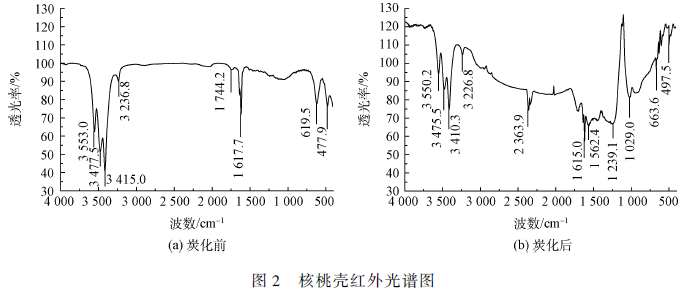 由圖2 可知, 核桃殼炭化前, 主要吸收峰有: 3 553. 0 cm - 1 、3 477. 5 cm - 1 、3 415. 0 cm - 1 和3 236. 8 cm - 1 處為O—H 的伸縮振動吸收峰, 1 744. 2 cm - 1 處為醛類C ?? O 的伸縮振動吸收峰,1 617. 7 cm - 1 處為N—H 彎(面內)曲振動吸收峰,619. 5 cm - 1 處為NH2 面外搖振動吸收峰,477. 9 cm - 1 處為C—I 伸縮振動吸收峰;氮炭化核桃殼的紅外掃面產生了新的譜帶,在2 363. 9 cm - 1 處增加了P—H 的伸縮振動吸收峰,C—O 與C—O—C 的伸縮振動吸收峰的疊加發生在1 239. 1 cm - 1 和1 029. 0 cm - 1 處,1 562. 4 cm - 1 處是N—H 彎曲(面內) 振動,O—H 的伸縮振動吸收峰發生了偏移,分別在3 550. 2 cm - 1 、3 475. 5 cm - 1 、3 410. 3 cm - 1 和3 226. 8 cm - 1 處,NH2 面外搖振動吸收峰和C—I 伸縮振動吸收峰也發生了偏移,分別在663. 6 cm - 1 和497. 5 cm - 1 處。與前者相比較,氮炭化后的核桃殼吸收振動峰有一定的變化,說明在氮氣氛圍下炭化后核桃殼化學結構有所改變,從增加的N—H 官能團也可以得出:核桃殼在炭化過程中,N2 也參與了反應地進行。