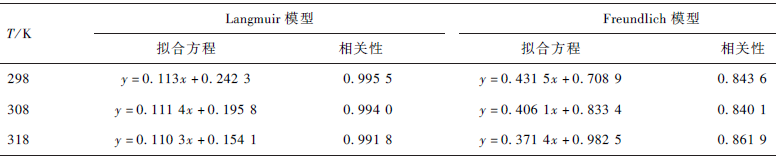 如圖8 所示,隨著反應溫度的升高,氮炭化核桃殼對吸附質(Cr(Ⅵ))的吸附量也在逐漸增加,且吸附等溫類型屬于I 型。當溫度為298 K、308 K 和318 K 時,其比較大吸附量依次為8. 751 mg·g - 1 、8. 963 mg·g - 1 和9. 151 mg·g - 1 。將實驗所得數據進行等溫模型擬合,其結果如表1 所示。