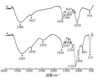 圖 7為菌株B. Cepacia C09G吸附孔雀綠及孔雀綠和Cr(Ⅵ)后的FTIR光譜圖.由圖 7可知,2939~2927 cm-1處的峰是—CH、—CH2及—CH3的不對稱振動峰,在1655 cm-1和1546 cm-1處出現(xiàn)由氨基酸I的—NH2與氨基酸II的—COOH形成的—NH/CO的伸縮振動吸收峰,1408~1405 cm-1處分別為孔雀綠及降解產(chǎn)物芳環(huán)上的C=C的伸縮振動峰和O—H的彎曲振動峰.圖 7b相比于圖 7a,在2452 cm-1和845 cm-1處的峰消失,1070 cm-1處峰的產(chǎn)生是由于氨基酸的—NH轉(zhuǎn)變?yōu)镃=N共軛鍵.這說明菌株C09G的去除過程主要是—OH、—COOH、—NH2、—NH/CO等官能團(tuán)與Cr相互作用(Nandi et al., 2009).