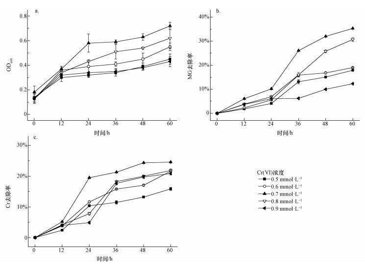 將已算好體積的藥品加入降解培養(yǎng)基中,每支玻璃離心管(無菌)中加入15.0 mL的降解培養(yǎng)液,再加入菌液(初始OD600=0.7,體積比6%),塞上棉花塞,放入搖床(150 r·min-1,30 ℃)培養(yǎng)0、12、24、36、48、60 h后分別測定OD600、MG和Cr(Ⅵ)濃度.上述每個試驗(yàn)均做3個平行,結(jié)果取其平均值,并計算標(biāo)準(zhǔn)偏差.