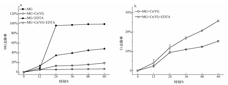 圖 2a為不同條件對孔雀綠的降解影響,在僅加入0.1 mmol·L-1 MG的情況下,MG在24 h的去除率達(dá)到96.2%;只添加0.5 mmol·L-1 Cr(Ⅵ),60 h時MG的去除率均為6.7%,單獨(dú)添加0.5 mmol·L-1 EDTA時,60 h時MG的去除率為48.4%,說明Cr(Ⅵ)和EDTA均會抑制B. Cepacia C09G對孔雀綠的降解.同時添加EDTA和Cr(Ⅵ)時,60 h MG的去除率上升到18.8%,相對于單獨(dú)加Cr(Ⅵ)的降解率有所提高,可以看出,EDTA確實(shí)可以有效地降低Cr(Ⅵ)的抑制作用,從而提高對孔雀綠的降解效率.也有研究證實(shí),加入EDTA可以降低5 μmol·L-1 Cd、Cu和Zn對細(xì)菌Escherichia coli的毒性(Campbell et al., 2000).