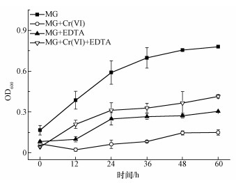 如圖 1所示,在空白實(shí)驗(yàn)中(沒有重金屬Cr(Ⅵ)或者EDTA存在的條件下),即僅加入0.1 mmol·L-1的孔雀綠(MG)時,B. Cepacia C09G在前36 h快速生長,OD600接近了0.7,而后因?yàn)镸G基本降解完,缺乏營養(yǎng)物質(zhì)生物量增長緩慢,60 h后比較終OD600值為0.78;僅加入0.5 mmol·L-1 Cr(Ⅵ),對微生物的生長有很強(qiáng)的抑制作用,生物量很低,僅為0.15;僅加入0.5 mmol·L-1 EDTA,毒性雖然比Cr(Ⅵ)更小,但仍有一定的抑制作用,60 h時OD600為0.31.據(jù)報道,EDTA和EDTA-Metal對土壤微生物都是有毒的(Grcman et al., 2001).當(dāng)同時添了EDTA和Cr(Ⅵ)時,OD600為0.42,大于單獨(dú)加入Cr(Ⅵ)或者EDTA時,說明其生物毒性比單獨(dú)加入Cr(Ⅵ)或EDTA有所降低,因此,可以推測EDTA可以有效降低Cr(Ⅵ)的毒性.