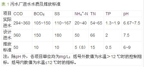 某污水處理廠日處理能力為7 萬m3,其污水主要由生活污水和部分工業(yè)污水組成,進水BOD5/COD <0.3,可生化性較差,TN 質(zhì)量濃度較高,在54~65mg/L 范圍內(nèi),TP 質(zhì)量濃度較低,僅為1.3~1.9 mg/L,其設(shè)計進水水質(zhì)指標見表 1,其中排放標準指《城鎮(zhèn)污水處理廠污染物排放標準》(GB 18918—2002)一級A 標準。