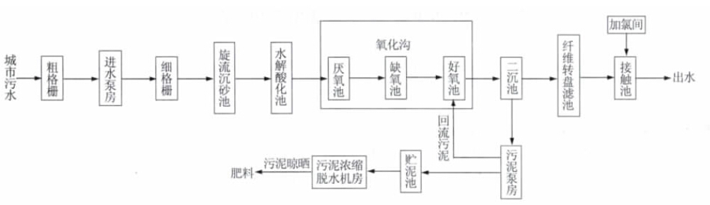 污水首先經(jīng)過粗格柵去除較大的漂浮物,再經(jīng)泵房將污水提升,經(jīng)過細格柵和沉砂池去除部分漂浮物及泥沙等易沉物質(zhì)后進入水解酸化池中,其中的大分子有機物經(jīng)水解酸化后,降解成小分子的有機物,提高了污水的可生化性。之后污水進入氧化溝,在氧化溝的厭氧池內(nèi)部分COD 被去除,污水的可生化性得到提高。經(jīng)厭氧處理的污水進入缺氧池完成反硝化脫氮過程。從缺氧池出來的污水,與從二沉池回流的污泥一并進入好氧池,在好氧池內(nèi)完成去除COD、硝化及吸磷過程。從氧化溝出來的污水進入二沉池進行固液分離,上清液流入纖維轉(zhuǎn)盤濾池做進一步處理,在纖維轉(zhuǎn)盤濾池中,污水中大部分的SS、部分COD 被除去,出水在接觸池內(nèi)與二氧化氯充分混合,殺滅水中可能含有的細菌和病毒后排放。二沉池內(nèi)排出的污泥一部分回流至好氧池,另一部分則進行濃縮脫水處理,加工成肥料再利用。