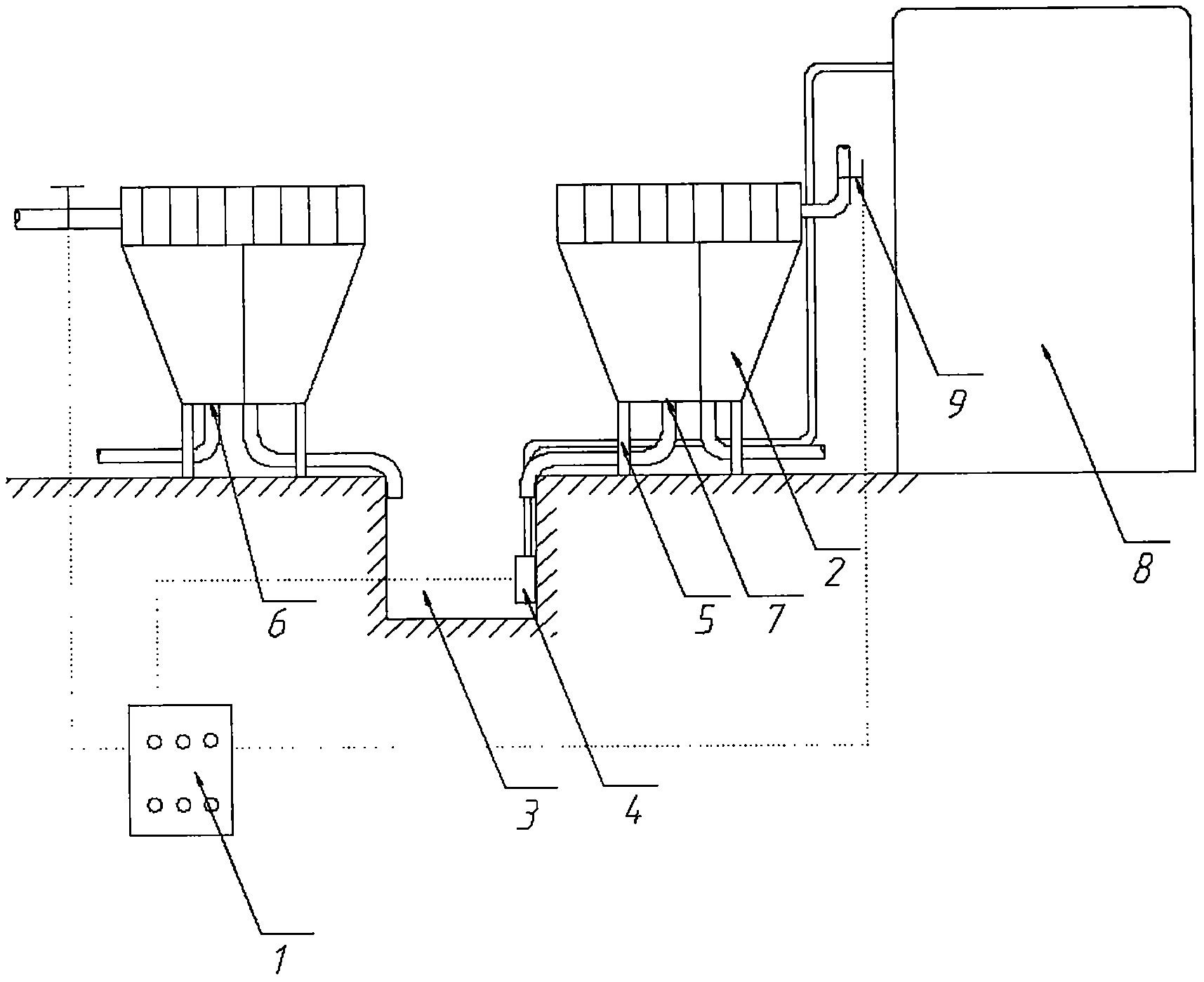本實用新型的有益效果:1、本實用新型壓濾機采用了全自動控制,節(jié)省了人力,加快了污泥和水分離的效率。2、本實用新型在壓濾間設(shè)計了一個壓濾水收集池,使壓濾水抽回PH調(diào)整池繼續(xù)處理,避免對環(huán)境造成污染。