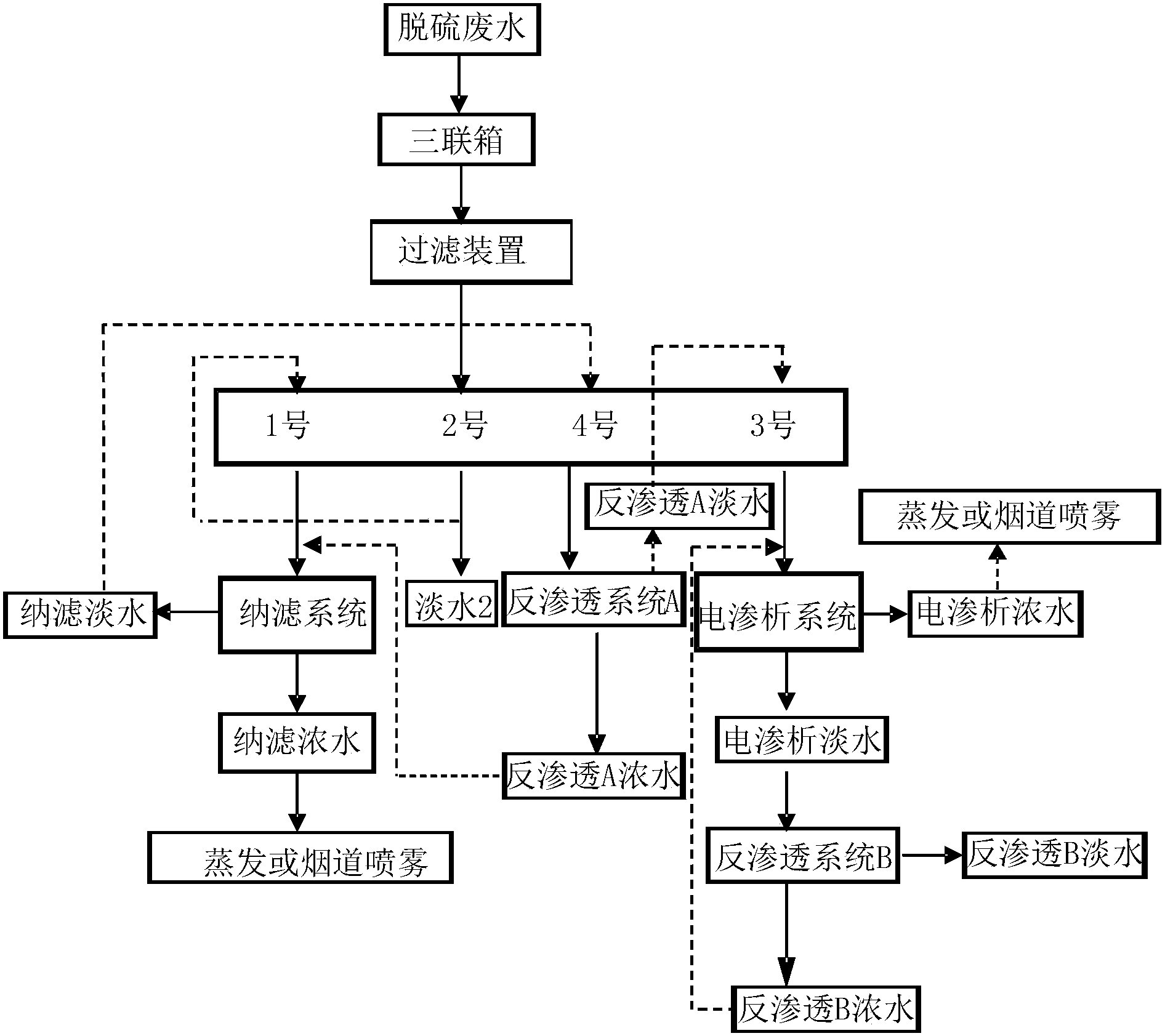 10.根據(jù)權(quán)利要求1所述的處理方法,其特征在于,經(jīng)過(guò)所述2號(hào)水流道單元離子重組的產(chǎn)水回用至冷卻塔補(bǔ)水或脫硫塔給水,所述反滲透B淡水回用至脫硫塔給水。