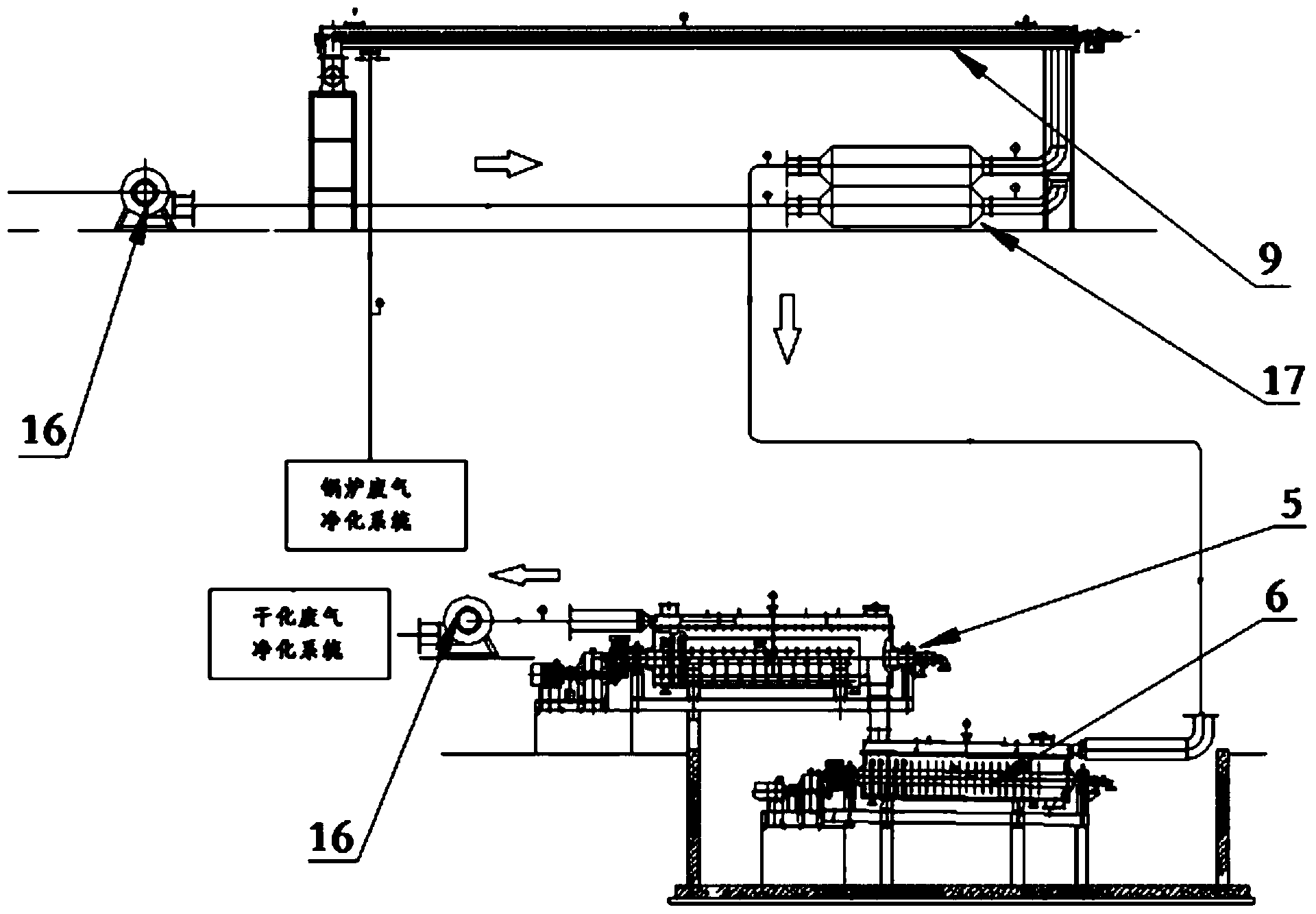 上述技術(shù)方案中,所述的污泥處置工藝,還包括尾氣處理步驟:高溫鍋爐廢氣進入氣體換熱裝置后將熱量傳遞給進入氣體換熱裝置的常溫空氣,降溫后的鍋爐廢氣繼續(xù)進入炭化污泥的烘干裝置,然后進入鍋爐廢氣凈化系統(tǒng);升溫后的空氣先后進入污泥炭化裝置、污泥干燥裝置然后成為干化廢氣,比較后進入干化廢氣凈化系統(tǒng)。