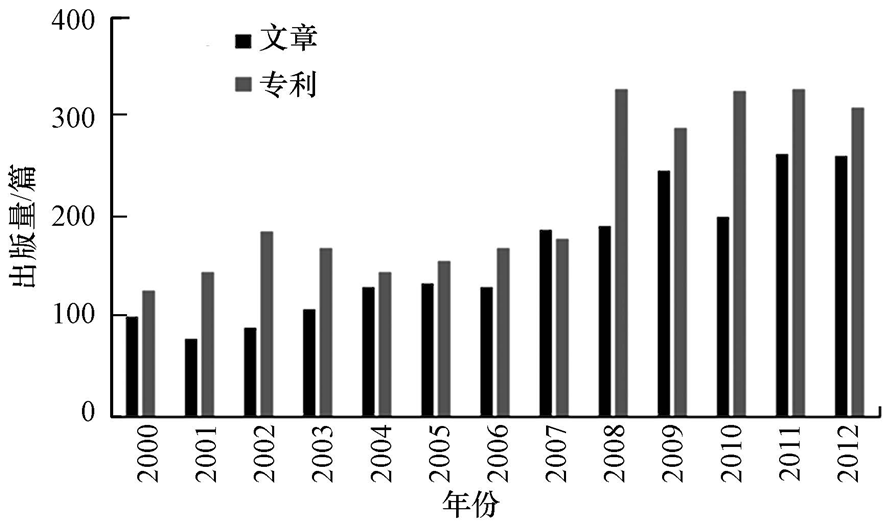 本研究所獲得的數(shù)據(jù)分別來自文獻檢索和專利檢索,并通過文獻計量分析法對其進行統(tǒng)計分析.文獻和專利檢索的時間跨度均為2000—2012年.