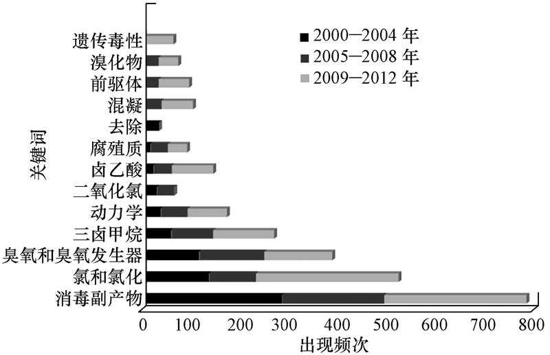 為了了解2000—2012年飲用水消毒領(lǐng)域的主要研究方向及整體變化趨勢,我們對本領(lǐng)域處于前10位的關(guān)鍵詞及其出現(xiàn)的頻次進行了統(tǒng)計,并且細分了3個階段(2000—2004年、2005—2008年和2009—2012年)來研究.如圖 2所示,“消毒副產(chǎn)物”、“氯和氯化”、“臭氧和臭氧發(fā)生器”、“三鹵甲烷”、“鹵乙酸”和“腐殖質(zhì)”這幾個關(guān)鍵詞在3個階段均排在前10位,表明這13年來飲用水的消毒研究方向主要集中在消毒工藝方法和消毒副產(chǎn)物兩方面.其中“消毒副產(chǎn)物”、“氯和氯化”、和“臭氧和臭氧發(fā)生器”這3個關(guān)鍵詞在3個時間段的出現(xiàn)頻次始終處于領(lǐng)先地位,進一步確定消毒工藝方法和消毒副產(chǎn)物研究在飲用水消毒領(lǐng)域研究的重要性.