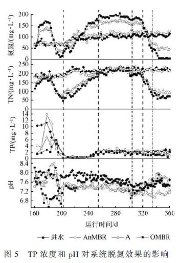 通過控制OMBR 的pH,考察pH 對脫氮效果的影響,結果如圖5 所示。系統從第300 天開始進行脫氮過程,但此時OMBR 的pH 低于7. 3,通過TN 和NH3 -N 濃度可以看出僅一天后脫氮效果即開始減弱。控制pH≈7. 5 后,第320 天重新開始脫氮過程。第335 天開始OMBR 的pH 高于7. 7,系統脫氮效果減弱。控制pH≈7. 5 后,脫氮效果逐漸恢復并于第345 天后穩定。實驗發現,系統出水NH3 -N 濃度受pH 的影響非常大,只有當pH 既能滿足好氧硝化細菌的比較佳生長pH 范圍,又能提供硝化過程足夠的堿度,NH3 -N 的去除率才能達到理想值( > 95% )。因此,本研究將MBR 的pH 控制為(7. 5 ± 0. 2)能較好地保證出水NH3 -N 和TN 的去除率和穩定性。