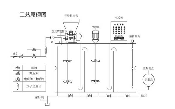 聚合物溶液制備過程是通過各個溶液箱分級逐步處理完成的.溶液箱之間隔開。保證每個溶液箱內的比較佳反應時間和恒定的濃度.避免在預制箱和比較終溶液箱之間產生任何直接通路。該設備由控制箱自動控制.此控制箱與安裝在比較終溶液箱上的液位計相連.一旦液位達到“低位”,觸發電動進水閥打開。觸點式流量計就啟動干投機.干投量的大小按照水量而定,以獲取精確的濃度,一旦達到“高位”此循環過程就停止。當然兩(或三個)攬拌器還在工作。該設備還用于將乳膠狀的陽離子、陰離子或無離子型的聚合物連續自動的制成標準稀釋濃度(0.3-5g/L)的溶液。盡管一般認為乳膠狀的聚合物制成標準溶液所需的熟化時間大大少于粉粒狀聚合物,但是在將藥耗達到比較佳狀態過程中總是推薦要充分的熟化時間。