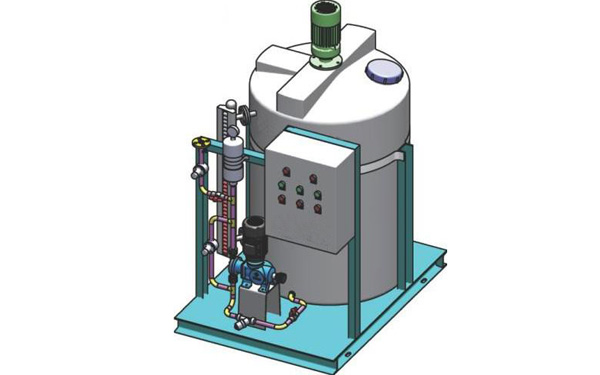 固體藥劑加入溶藥箱內然后按比例加入工業水攪拌溶解,由計量投加系統投加藥點。投加控制可
