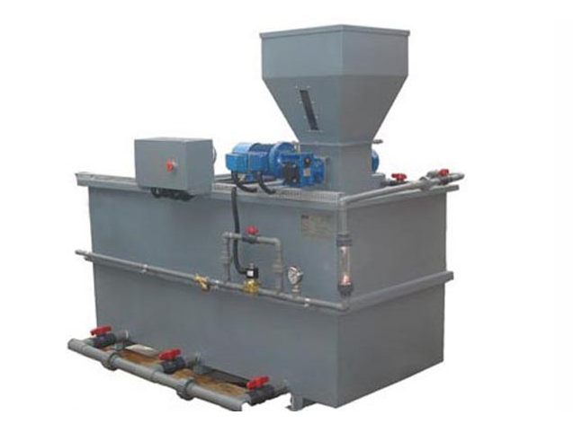 聚合物溶液制備過程是通過各個溶液箱分級逐步處理完成的.溶液箱之間隔開。保證每個溶液箱內(nèi)的最佳反應(yīng)時間和恒定的濃度.避免在預(yù)制箱和最終溶液箱之間產(chǎn)生任何直接通路。該設(shè)備由控制箱自動控制.此控制箱與安裝在最終溶液箱上的液位計相連.一旦液位達到“低位”,觸發(fā)電動進水閥打開。觸點式流量計就啟動干投機.干投量的大小按照水量而定,以獲取精確的濃度,一旦達到“高位”此循環(huán)過程就停止。當然兩(或三個)攬拌器還在工作。該設(shè)備還用于將乳膠狀的陽離子、陰離子或無離子型的聚合物連續(xù)自動的制成標準稀釋濃度(0.3-5g/L)的溶液。盡管一般認為乳膠狀的聚合物制成標準溶液所需的熟化時間大大少于粉粒狀聚合物,但是在將藥耗達到最佳狀態(tài)過程中總是推薦要充分的熟化時間。
