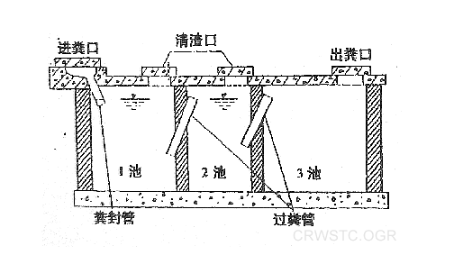 新鮮糞便由進糞口進入池,池內糞便開始發酵分解、因比重不同糞液可自然分為三層,上層為糊狀糞皮,下層為塊狀或顆狀糞渣,中層為比較澄清的糞液。在上層糞皮和下層糞渣中含細菌和寄生蟲卵比較多,中層含蟲卵比較少,初步發酵的中層糞液經過糞管溢流至第二池,而將大部分未經充分發酵的糞皮和糞渣阻留在池內繼續發酵。流入第二池的糞液進一步發酵分解,蟲卵繼續下沉,病原體逐漸死亡,糞液得到進一步無害化,產生的糞皮和糞 厚度比池顯著減少。流人第三池的糞液一般已經腐熟,其中病菌和寄生蟲卵已基本殺滅。第三池功能主要起儲存已基本無害化的糞液作用。的作用