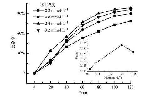 圖 9 KI添加濃度對UVA/H2O2/KI降解磺胺嘧啶的影響(插圖為不同KI添加濃度下準一級反應速率常數(shù))