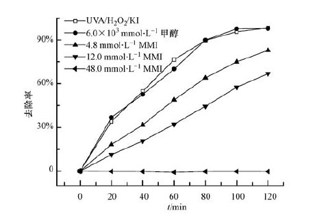 為探究UVA/H2O2/KI體系降解磺胺嘧啶的活性自由基類型,對初始濃度0.04 mmol·L-1的磺胺嘧啶溶液,在pH=3.2,H2O2、KI添加濃度分別為120.0、2.4 mmol·L-1條件下,考察了甲醇和甲硫咪唑(MMI)分別對磺胺嘧啶光降解的抑制情況,結果如圖 11所示. 由圖 11可見,加入過量甲醇(HO·抑制劑)(Yeo et al.,2009)對UVA/H2O2/KI體系降解磺胺嘧啶幾乎沒有影響,說明HO·非該體系的主要活性物質.甲硫咪唑作為HO·和碘自由基(I·、I2-·)的抑制劑(Taylor et al.,1984),對磺胺嘧啶的降解有明顯的抑制作用.當甲硫咪唑添加量為4.8 mmol·L-1時,120 min后磺胺嘧啶的去除率由98.2%降低至82.8%,這與H2O2/KI體系降解磺胺嘧啶的效果相當.增加甲硫咪唑添加量至12.0 mmol·L-1,去除率降低至66.7%,繼續(xù)增加其添加量至48.0 mmol·L-1,則完全抑制了UVA/H2O2/KI體系對磺胺嘧啶的降解. 因此,碘自由基(I·、I2-·)是UVA/H2O2/KI體系降解磺胺嘧啶的主要活性物質.