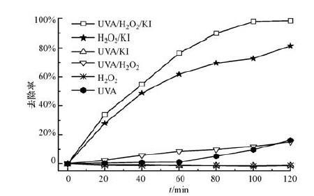 實驗考察了初始濃度為0.04 mmol·L-1的磺胺嘧啶溶液,分別在單獨紫外輻射(UVA)、H2O2氧化、UVA/H2O2、UVA/KI、H2O2/KI和UVA/H2O2/KI 6種反應條件下的降解情況(圖 2).其中,溶液初始pH值為3.2,KI、H2O2添加濃度分別為2.4和120.0 mmol·L-1,除光降解實驗外,其余均在避光條件下進行.