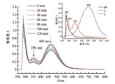 圖 3 H2O2/KI體系降解磺胺嘧啶過程中的紫外-可見吸收光譜圖(插圖為水中不同物質吸收光譜圖)