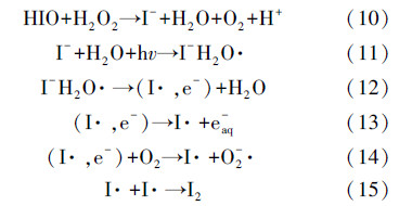 當溶液初始pH值增加至6.2,體系中I2和I3-相對較少(圖 6),但磺胺嘧啶的去除率反而較高.這可能是由于偏中性條件下H2O2氧化性弱,會被中間氧化物HIO氧化(式(10))(Matsuzaki et al.,1972),故0 min時,I2和I3-含量甚微,體系中以I-為主.I-在紫外光作用下通過電子轉移形成復合體I-H2O*,該復合體自身分離(式(11)~(12)),同時反應(10)中產生的O2作為電子受體能夠極大地促進復合體分離,促使I·、I2-·及O2-·等一系列自由基的產生(式(9),式(13)~式(14))(Yeo et al.,2009),故一定程度上增強磺胺嘧啶的去除效果,同時由于反應(15)、(4)使得體系中I2和I3-逐漸增加.偏中性條件UAV/H2O2/KI體系對磺胺嘧啶的作用機理有待進一步研究.本次研究結合磺胺嘧啶去除率及k值,將pH=3.2作為碘增強磺胺嘧啶紫外光降解的比較佳值.